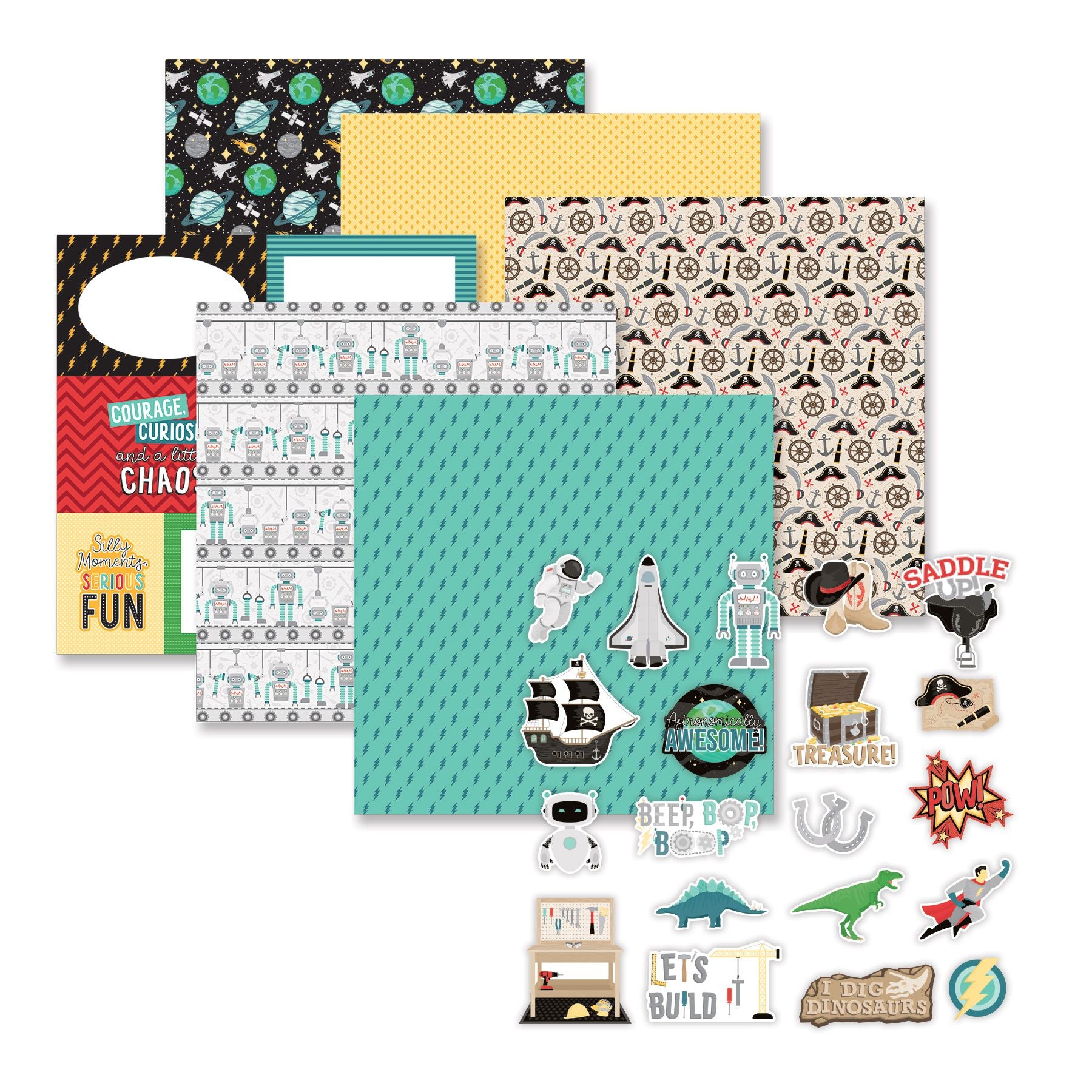 このセットには、恐竜や街のスカイライン、馬の蹄鉄など、ワクワクする模様がたっぷり入ったペーパーパックとエンベリッシュメントが含まれています。